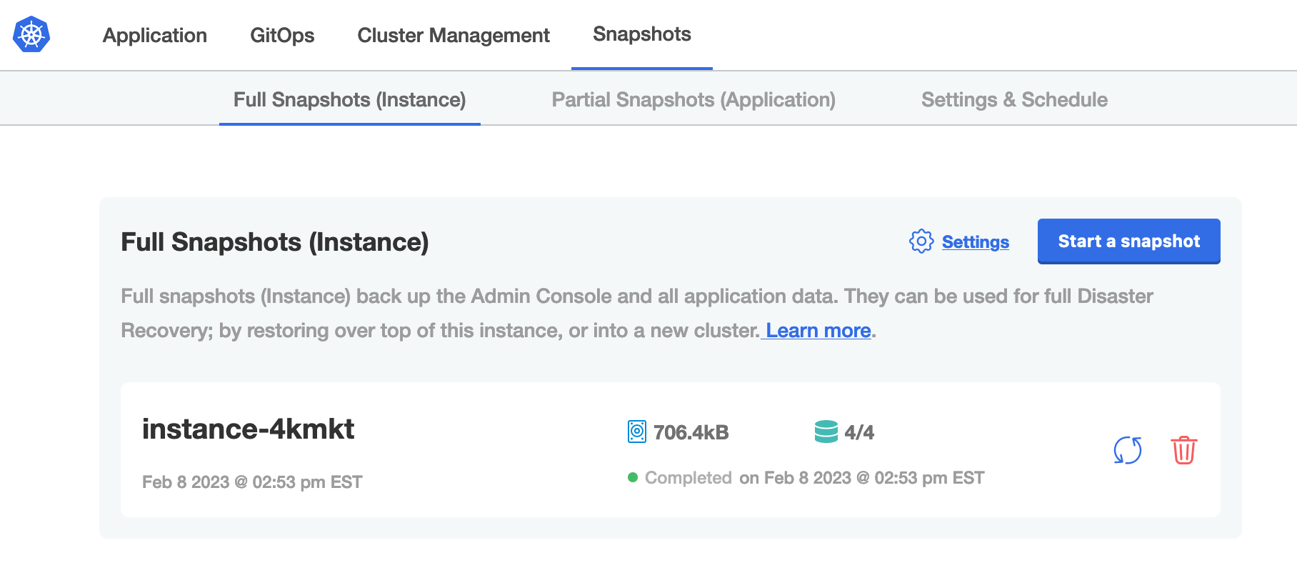 • Only full backups that include both the application and the Admin Console can be restored to a new cluster in disaster recovery scenarios. Partial backups that include the application only cannot be restored to a new cluster, and are therefore not useable for disaster recovery.
